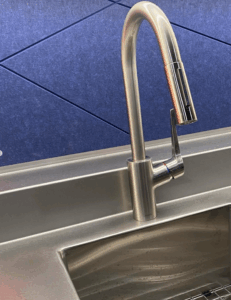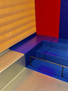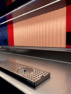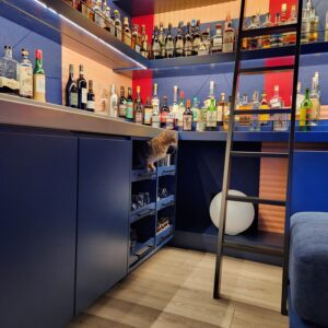 The ceiling acoustic matches the blue. Everything blends and dissolves while the flat warm vibrant colors enhance the shiny bottles, liquids and beautiful labels. The wet bar has a formed stainless steel counter with an integrated back ledge and a drop in bar sink welded into the counter to create an integral seamless surface.