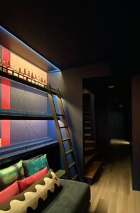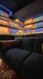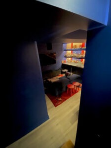 Our intent was to create a portal journey from a bright world to a deep, moody bar lounge. m+ selected a deep saturated blue for all walls, ceiling and millwork with the only contrast being the stair treads for low light safety and the existing floors.