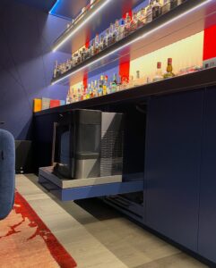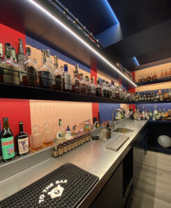All bottle riser sections are removable for intermittent display options. All appliances are under counter with millwork facing and a specialty countertop ice maker is set into a fully extendable pull out drawer with a stainless water pan to keep the bar surface appliance free.