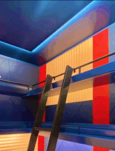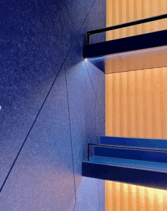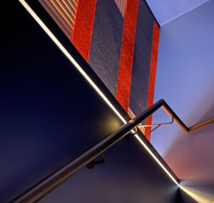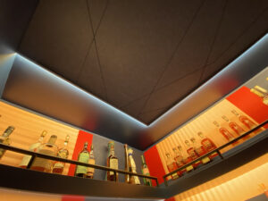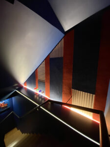 We also created graphic impact with red, peach and deep blue acoustic panel cut ins installed over a drywall substrate containing additional acoustic insulation. The acoustics are strategically placed behind the bottles, ceiling, and stairwell absorbing the sound and using the bottles as a baffle trapping noise behind them and eliminating echoes.